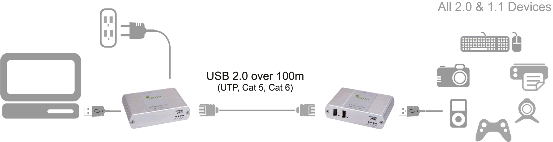 Extends USB 2.0 high-speed and USB 1.1 (low-speed, full speed) devices up to 100m over Cat 5 cable
