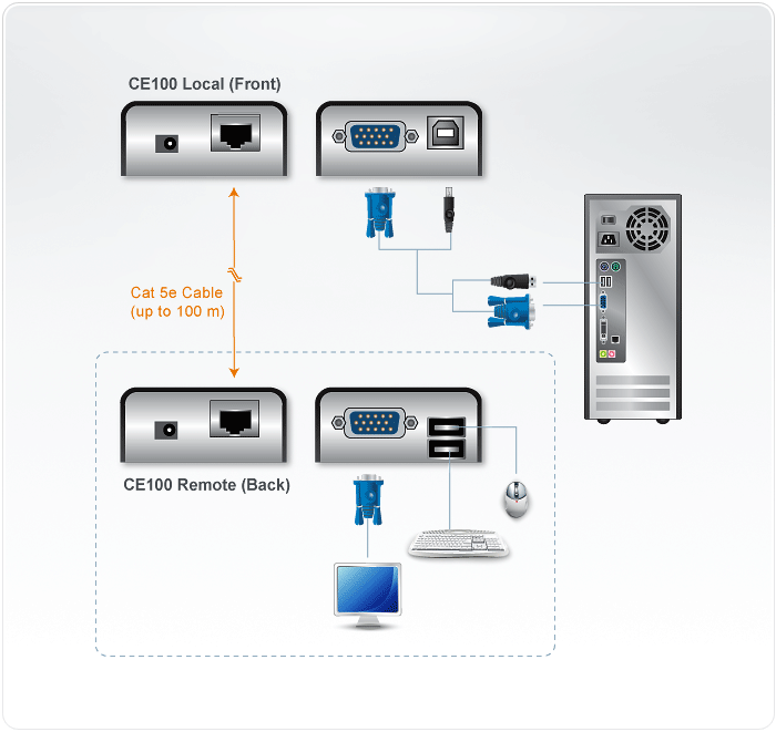 The Aten CE100 VGA USB Mini KVM Extender with superior video quality (1280x1024) and built-in ESD protection allows access to a computer system from a remote USB console (USB keyboard, USB mouse, and monitor) up to 100 Meters