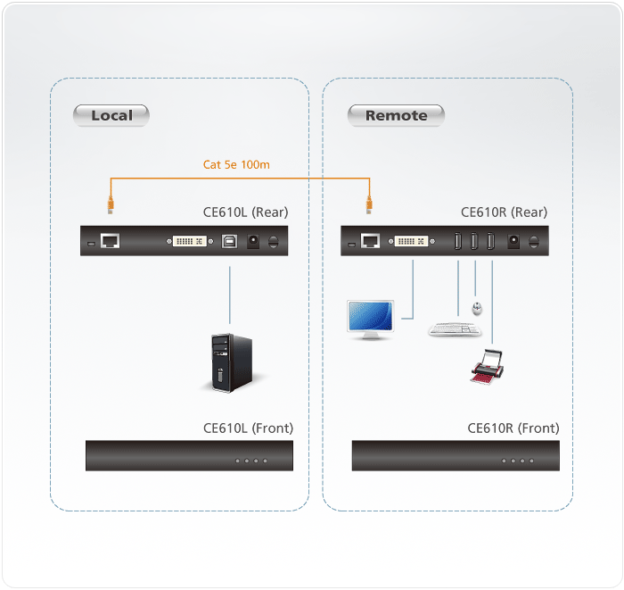 The Aten CE610A USB 2.0 DVI KVM Extender is a DVI and USB Extender that supports Extreme USB® and HDBaseT technology. The CE610 USB 2.0 DVI KVM Extender can extend DVI and USB 2.0 signals up to 300 ft (100 m) from the source using a single Cat 5e/6 cable.