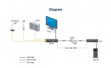 A complete set of KFH101S including Transmitter (KFH101S-TX) and Receiver (KFH101S-RX). The Transmitter is connected to a computer or server, and the receiver is connected to a display, keyboard, audio player and other USB devices.