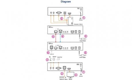 A complete set of KFH163S device consists of a transmitter (KFH163S_TX) and a receiver (KFH163S_RX). The transmitter can be connected to a computer or server, and the receiver can be connected to a monitor, keyboard, mouse, audio player and other USB devices.