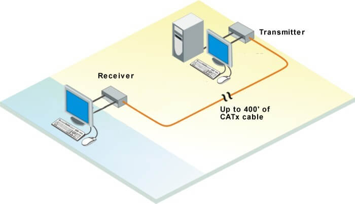 The system consists of two Units, a transmitter and a receiver. The transmitter connects to your CPU’s keyboard, DVI monitor, and mouse connectors, or to a Rose KVM switch. The receiver connects to a keyboard, DVI video monitor and mouse or KVM station. The transmitter and receiver are connected together with CATx industry standard cable. The receiver can be up to 140 meters from the transmitter using CAT5, 5e, 6, or 7 cables.