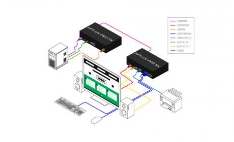 The HFX-UX-PRO revolutionizes high-definition signal extension by delivering UHD 4K60 (3840 x 2160) video, full USB 2.0, keyboard-mouse, serial, and bidirectional audio over significant distances up to 2 km (1.24 miles) via a single-mode fiber. This is achieved through an innovative single fiber cable connection, surpassing the limitations of traditional HDMI extenders that demand specialized dual fiber cables.
