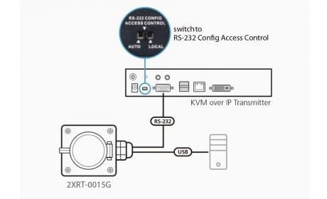 3. Connect the RS-232 connector of the 2XRT-0015G to the RS-232 Port of the KVM over IP Transmitter and connect the USB connector of the 2XRT-0015G to a computer for USB bus-power supply