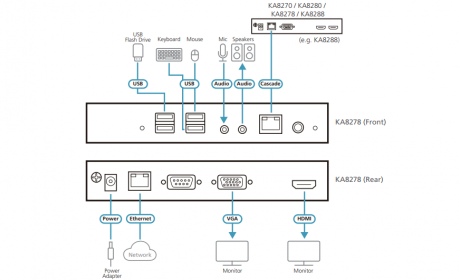 All the KA8270, KA8278, KA8280, and KA8288 support USB mouse / keyboard and two USB ports for Virtual Media function, and respectively support 1 VGA video output, 1 VGA plus 1 HDMI video outputs, 1 HDMI video output, and 2 HDMI video outputs at resolutions up to 1920 x 1200 @ 60 Hz. With KA8278 and KA8288, users can multitask across two displays with a single keyboard and mouse.