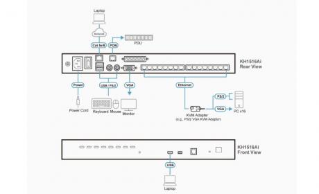 In addition to TCP/IP connectivity, the KH1508Ai / KH1516Ai provides console ports for a locally attached USB or PS/2 console and a Laptop USB Console (LUC) – allowing access and control from the data center as well as over the net.