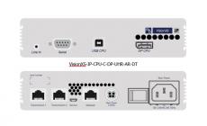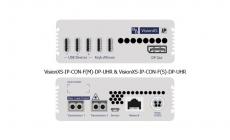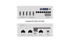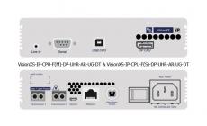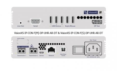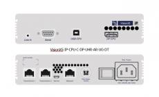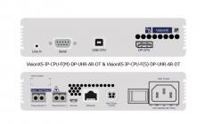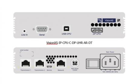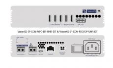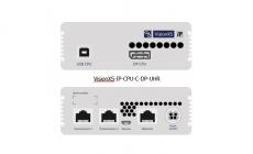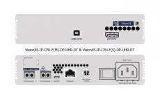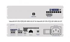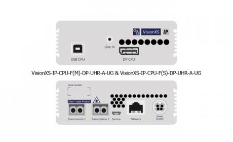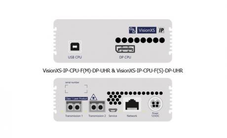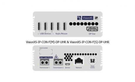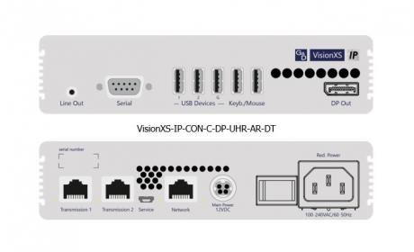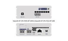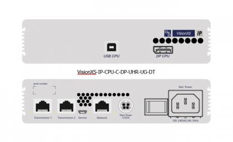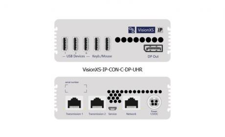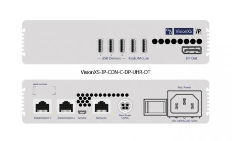 The matrix-compatible KVM-over-IP extenders of the VisionXS-IP-DP-UHR series extend keyboard, video, and mouse signals, as well as other peripheral data (e.g., audio and USB), via a standardized IP network infrastructure with CAT or fiber connection (up to 10,000 m).