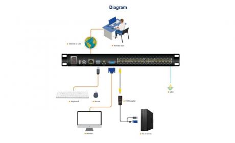 The HT12xx IP KVM features IP-based connectivity that allows 1 local and 2 remote operators to monitor and access the computers. With TCP/IP communications protocol, the HT12xx IP KVM can be accessed from any computer on the LAN, WAN or Internet.