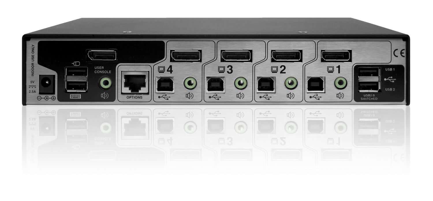 The AV4PRO-DP is designed to enable four computers equipped with DisplayPort technology to be controlled from a single KVM console. The switch makes use of Adder's True Emulation Technology which enables USB HID (Low and Full speed) devices to be continuously emulated to each computer.