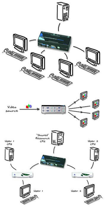 AdderView Prism - a 'reverse KVM switch' that enables up to four consoles to access a single computer or KVM switch. Ideal for video splitting, resource sharing and KVM matrix applications.