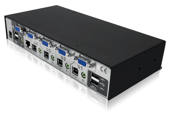 The AV4PRO-VGA is designed to enable four computers to be controlled from a single high resolution KVM console using high definition analogue VGA video links. The switch makes use of Adder's True Emulation technology which enables USB HID devices to be continuously emulated to each computer. This unique technology enables instantaneous and reliable hotkey switching whilst also supporting the extra keys and features of enhanced keyboards and mice. Furthermore, the AdderView includes two independently switchable USB 2.0 channels and an audio channel, giving the user the flexibility to attach selected peripherals to different computers.