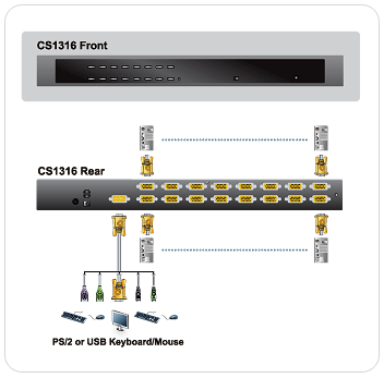 The Aten CS1316 KVM switch allows access and control up to 16 computers from a single console (keyboard, mouse, and monitor). As many as 16 additional switches can be cascaded* bringing the total number of connected computers to 256 computers that can be controlled from a single keyboard-monitor-mouse console. The switch supports both USB and PS/2 connections for the console and computers.