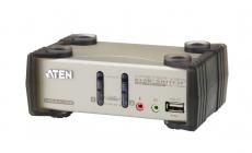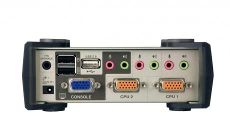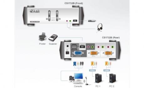 The CS1732B is 2-port KVM switch combined with a 2-port USB 2.0 hub. As a KVM switch, it allows users to access two computers from a single keyboard, monitor, and mouse console. There are four methods to obtain instant access to any computer in your installation: Pushbuttons, Hotkeys, OSD, and mouse.
