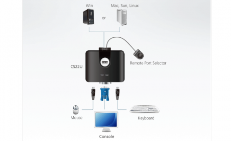 The CS22U is a 2-port USB Cable KVM Switch that provides a simple and quick method of selecting computers - a built-in remote port selector. This allows the CS22U unit to be hidden from sight, while the remote port selector can be placed conveniently on the desktop.