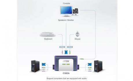 CS62A 2-Port KVM Switch has a handy design integrating with 4 feet of cables. It can control 2 servers via a single console.