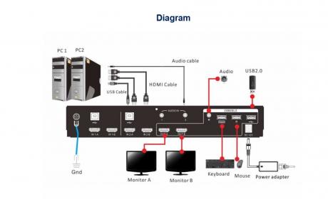 Kinan DM7202 is a 2-port dual monitor HDMI KVM switch that supports 2 monitors and allows users to control 2 computers simultaneously with 2 HDMI interfaces via a single USB keyboard and mouse. It is easy to set up this KVM switch with 2 monitors. Just plug the cables into the ports correctly according to the instructions. There is no complicated installation procedures and required software.