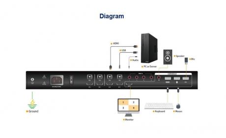 MH2404 supports high-quality video resolution up to 4K (3840 x 2160 @ 60 Hz), and provides Quad-View mode and Full-Screen mode. Moreover, MH2404 supports a unique switching technology. In the quad-view mode, it allows user simply move the mouse to another screen to switch to another source quickly. When switching, the border of the port will flash to prompt the position of the mouse and keyboard, helping the user to quickly select the target device to switch to.