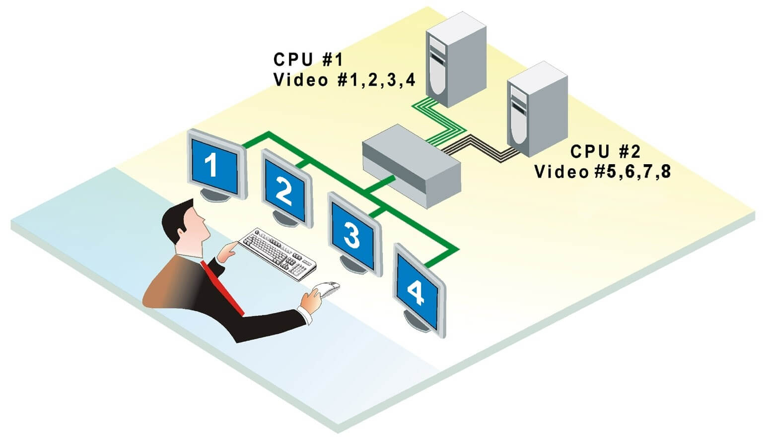 MultiVideo delivers keyboard command switching between different CPUs that are sending multiple video signals. With MultiVideo a user can easily switch between multiple computers to view up to 4 video outputs per CPU. Audio switching is available in multiplatform models. Daisy chain MultiVideo units to support up to 64 CPUs.