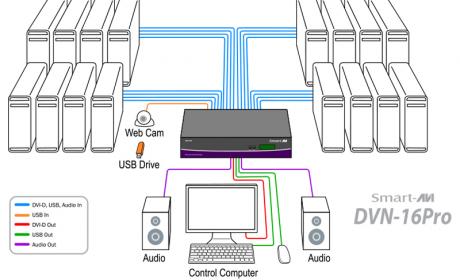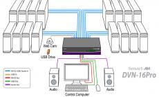 The Smart AVI DVN-16Pro is a dedicated multi-platform KVM switch capable of managing up to 16 different computers through a single DVI-D monitor, USB keyboard & mouse, a single set of speakers and USB 2.0 device sharing.