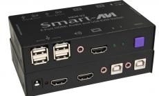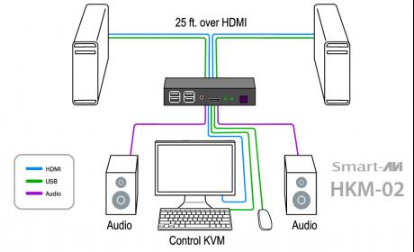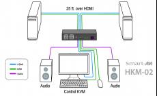 The Smart AVI HKM-02 is a cross-platform KVM Switch capable of sharing a WUXGA Display, USB Keyboard and Mouse, and Stereo Audio between two computers.
