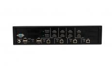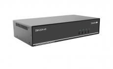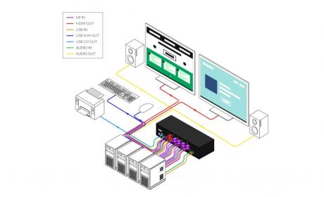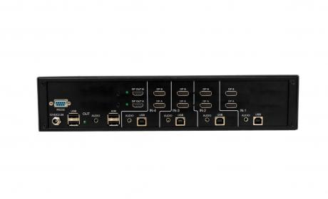 The SM-D2H-4D (formerly D2H-4P-Duo) is a dedicated multi-platform KVM Switch capable of managing up to 4 different computers through two monitors, USB keyboard & mouse, a set of speakers and USB devices like printers, memory devices, scanners, etc. The video connectors on the unit are DisplayPort, which allows support for HDMI and VGA using inexpensive passive adapters or cables.