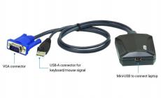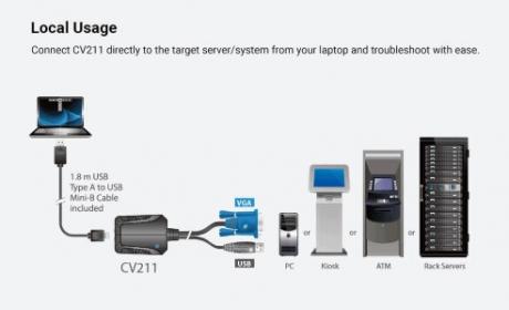 The CV211 Laptop USB KVM Console Crash Cart Adapter provides a direct Laptop-to-Computer connection to servers, computers, kiosks and ATMs. It eliminates the need for heavy crash carts while offering BIOS-level access, bi-directional file transfers, hotkey macros, video recording and screenshots through a USB 2.0 and VGA composite cable.