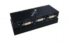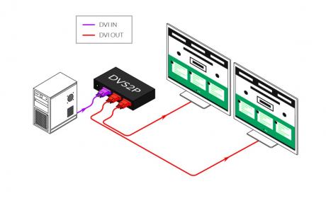 The DVS2P is a 2-port DVI splitter, which can send one DVI video source signal to two connected DVI monitors for identical displays.