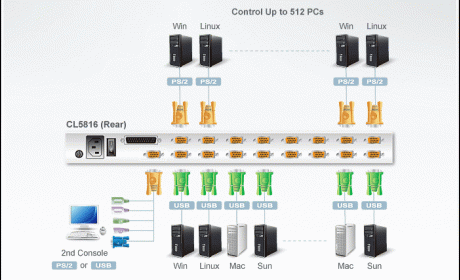 The CL5808 supports both PS/2 and USB keyboards and mice for the connected computers, and the CL5816 supports USB peripheral devices to be used with the attached computers. A single CL5816 can control up to 16 computers.