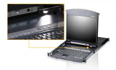 The Aten KL1516A Dual Rail LCD KVM Switch is a control unit that allows secure access to 16 computers from a single KVM (keyboard, video, and mouse) console. It consists of an integrated 17" or 19" LCD monitor, keyboard, and touchpad mouse in a 1U rack-mountable retractable sliding housing.