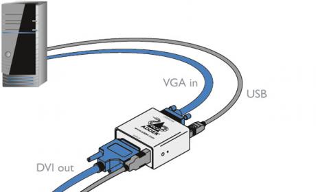 ADDER DVA is a high performance VGA to DVI-D video converter that transforms analog signals to digital. Placed in-line and USB powered.  It converts VGA signals, up to 1920 x 1200 @ 60Hz, into a DVI standard equivalent with EDID support