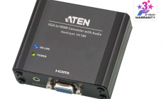 The Aten VC180 is a VGA-to-HDMI Converter with Audio that lets you view VGA source data in an HDMI output display with stereo sound quality. It uses dual power sources – from the VGA port or a power adapter.