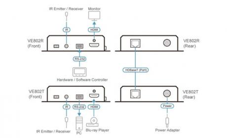 The VE802 HDMI HDBaseT-Lite Extender extends an HDBaseT signal up to 70m from the HDBaseT source using one Cat 5e/6/6a cable. VE802 supports RS-232 and IR signaling passthrough, allowing you to control the HDMI source device from the remote unit (VE802R) while also granting access to the HDMI display device from the local unit (VE802T). IR signals can also be extended in both directions. The VE802 features Power over HDBaseT (PoH) which can send power over Cat 5e/6/6a cable without an additional power supply. The VE802 is HDMI (3D, Deep Color,4k) and HDCP compatible. The VE802 is perfect for a digital entertainment center or any installation that requires superior video quality.