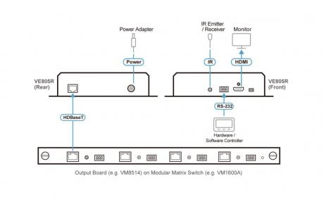 • HDBaseT connectivity – extends the connection between the VM8514 HDBaseT outputs and an HDMI display over a long distance via single Cat 5e/6/6a cable