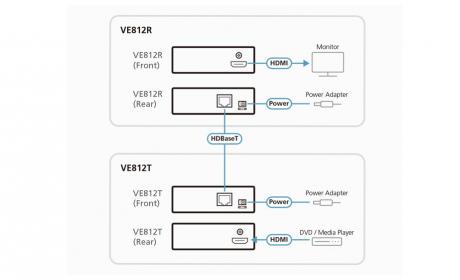 The VE812 HDMI HDBaseT Extender enables an HDMI display to be located up to 100 meters away from the source device. It can be conveniently extended using only one Cat 5e cable, which is cost-effective.