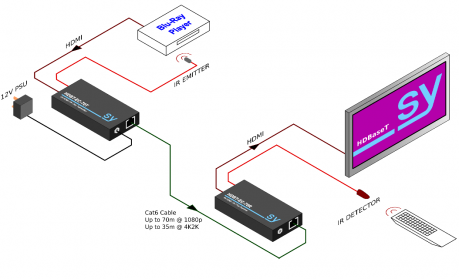 Broadcasts a single HDMI signal via catX cable up to 70m at 1080p or 40m at 4K with PoC.