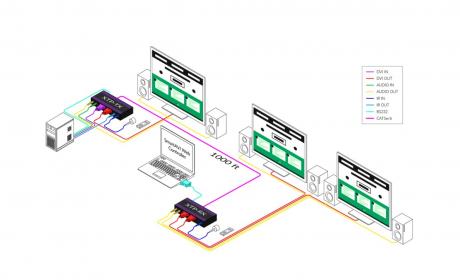 The XTPRO is a high resolution UXGA and stereo audio extender system (transmitter and receiver) designed to broadcast desktop video, stereo audio signals, IR and RS-232 over unshielded twisted pair (UTP) cabling. With RS-232 communication support the XTPRO allows users to send commands to single or multiple devices. This allows the user to change the volume, change the channel or turn on/off the display panel remotely