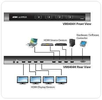 The Aten VM0404HA is a 4x4 HDMI Matrix Switch with IR and RS232 Serial control provides a convenient way to route high definition & 2K4K video and audio from any of four HDMI sources to any of four HDMI displays.