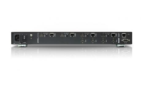 The ATEN VM3404H HDMI HDBaseT-Lite 4X4 video Matrix Switch with 2X2 Video Wall Controller extends uncompressed 4K / Full HD digital video, audio, IR and power via HDBaseT technology through a single Cat 6a cable up to 40/70 meters.