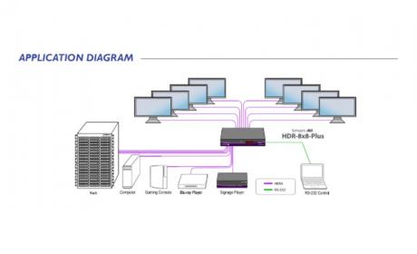 With the HDR-8x8-Plus, users can independently route eight video inputs to eight displays using the latest in 4K (3840x2160 @30Hz) HDMI video technology. The HDR-8x8-Plus has eight outputs that offer the flexibility to distribute HD audio and video signals across multiple displays, eliminating the tedium of disconnecting and reconnecting HDMIs to a single display. Controlling the matrix switch is simple with the front-panel buttons and RS-232 commands. Even use the TCP/IP controls to manage the unit from a web browser. The perfect multi-switch solution for your home theatre system, the HDR-8x8- Plus is compatible with computers, live HD TV feeds, Blu-ray players, gaming consoles, video cameras and more