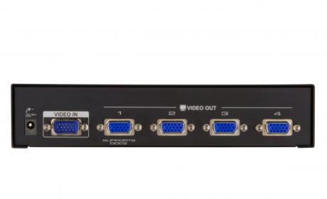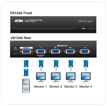 The Aten VS134A 4 port Video Separator is a signal booster and splitter that is used to take video input from a single source and direct it to four video outputs for monitors using analog signals. The signal boost obtained by using the VS-134 allows you to not only split the signal but to extend the distance so that you can send the signal to about 210 feet.