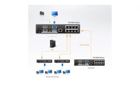 The VS1508 Cat 5 Audio/Video Splitter is a splitter designed to connect one source to 8 displays over a long distance. Incorporating suggested compatible receivers *, the VS1508 A/V Over Cat 5 Splitter can be a complete solution ideal for any professional A/V installation that requires multimedia content to be delivered to multiple destinations located up to 500 m away from the source.
