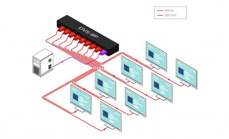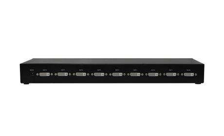 The DVS8P is a 8-port DVI splitter, which can send one DVI video source signal to eight connected DVI monitors for identical displays.