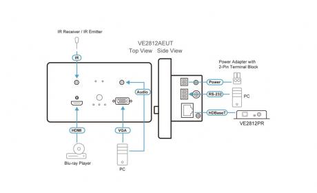 ATEN VE2812AEUT is a transmitter for sending VGA (with audio) and HDMI signals up to 100 m over a single Cat 5e/6/6a or ATEN 2L2910 Cat 6 cable.