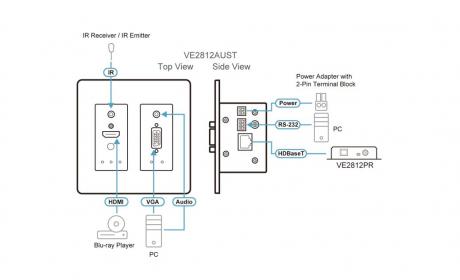 ATEN VE2812AUST is a transmitter for sending VGA (with audio) and HDMI signals up to 100 m over a single Cat 5e/6/6a or ATEN 2L-2910 Cat 6 cable. Featuring built-in PoH (Power over HDBaseT) function, the VE2812AUST receives power supply from the HDBaseT output port on the connected device. This eliminates the need for a power adapter and reduces the hassle of power line deployment behind the wall.