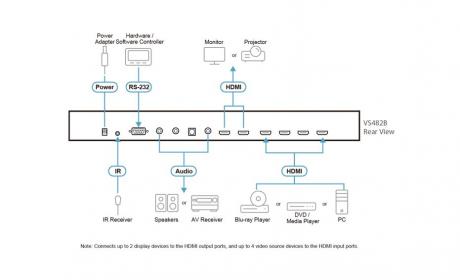 Furthermore, the VS482B offers switching methods between HDMI sources by front panel pushbuttons, IR remote control and RS-232 commands, enabling users to effortlessly select desired input. Equipped with EDID Expert™, the VS482B benefits users with optimum EDID settings for smooth power-up and highest-quality display across different screens. Featuring above functionalities provides you a practical solution for auditorium, home theater, meeting rooms, trade shows, shopping centers, and more.