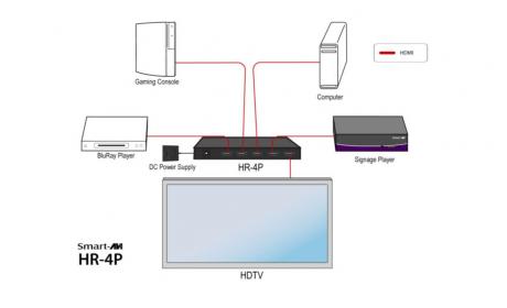 The HR-4P is a powerful 4-port HDMI signal switching solution designed for simple set-up and easy operation. Equipped with four HDMI inputs and one HDTV-ready output, HR-4P switches between source signals at the press of a button. Better yet, HR-4P features infrared remote control support, so users can switch things up from any distance.