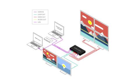 The EZW-UH4 is a HDMI 2.0 Video Wall controller with 2 HDMI input, 2 HDMI loop out and 4 HDMI scaling out for video wall processing. With PC Tool or RS232 commands to control the product for different wall display.