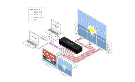 This product is a HDMI 2.0 Video Wall controller with 2 HDMI input, 2 HDMI loop out and 9 HDMI scaling out for video wall processing. With PC Tool or RS232 commands to control the product for different wall display.